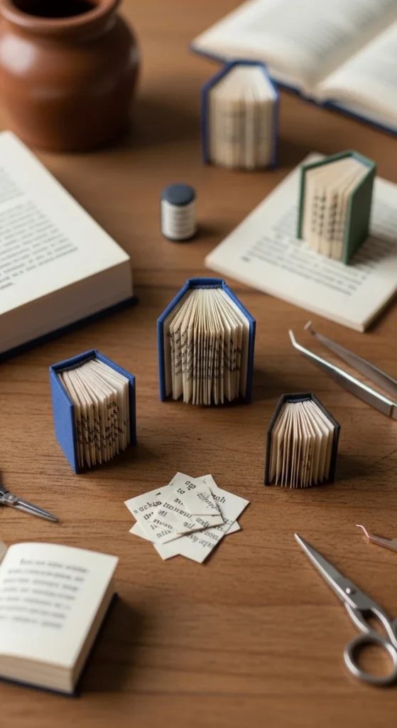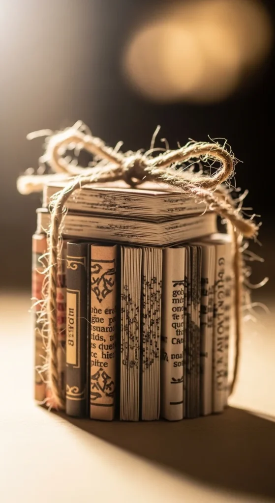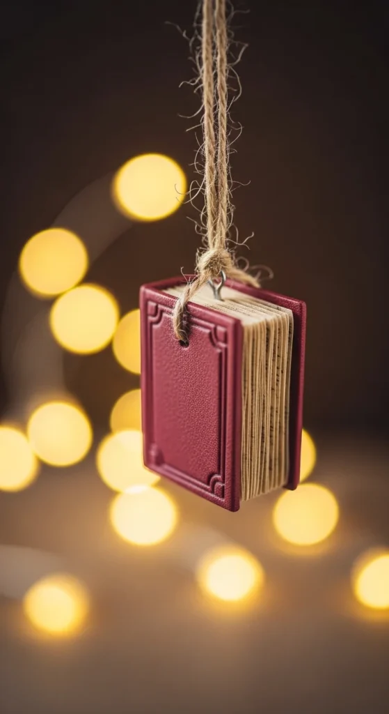 Mini books look adorable on a tree. Cut small rectangles, fold into little “books,” and stack 8–12 together. Wrap a thin twine loop around the stack and tie it.