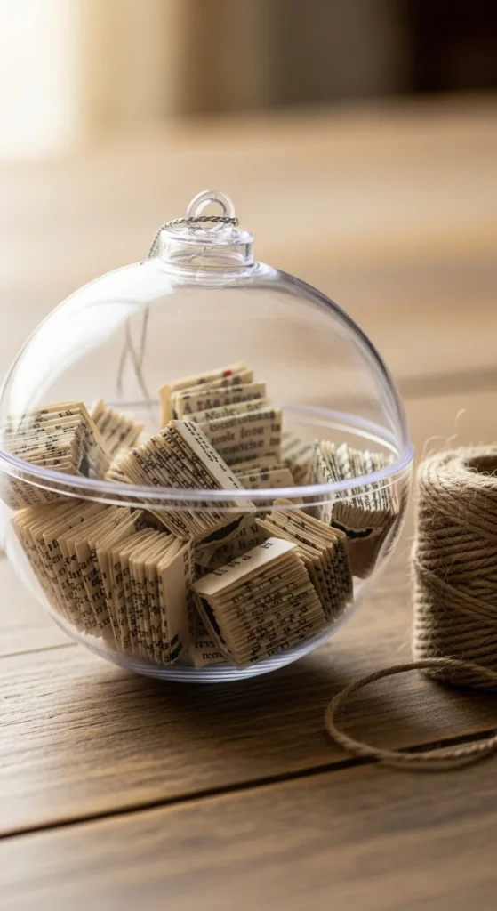 Fillable ornaments are quick. Make mini books and drop them inside. Add a few tiny crumpled paper bits to fill space and keep books from shifting.