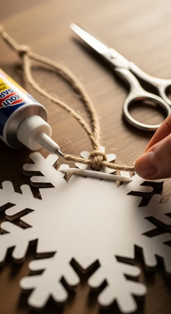 If you don’t want metal hooks, use twine loops on every ornament. Cut twine, tie a loop, and glue it under a back circle or seam.