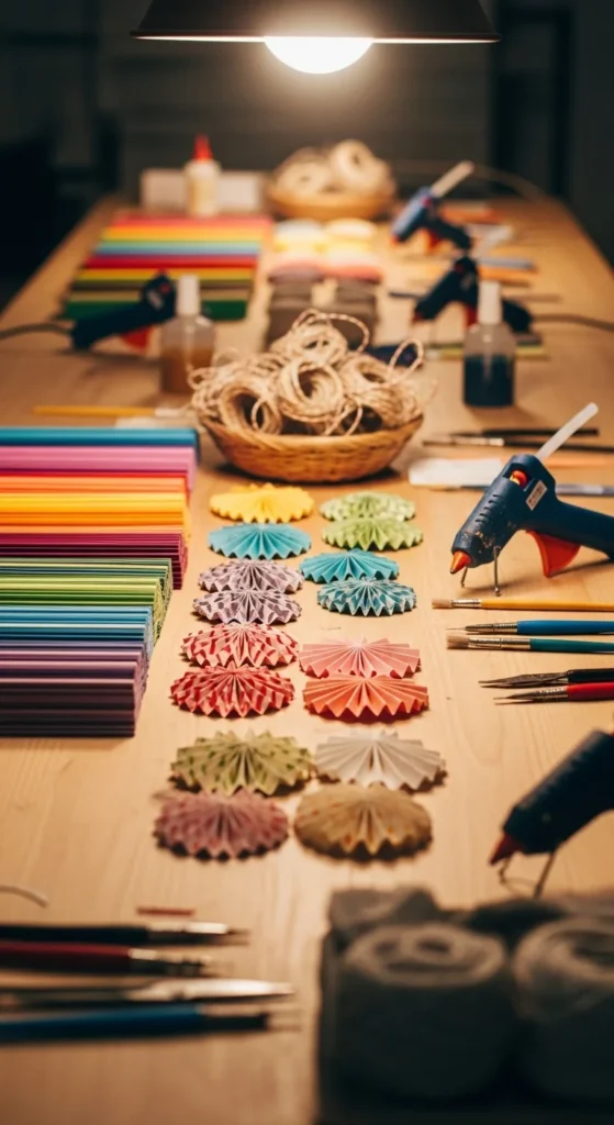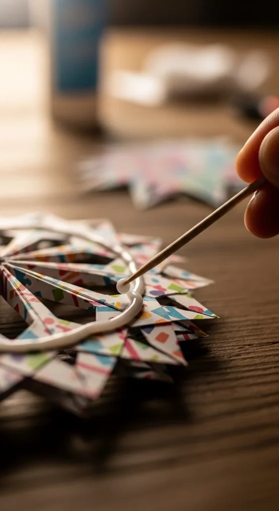 If you’re making a lot, work in batches. Cut all strips first. Fold all strips second. Glue rosettes third. Add centers and hangers last.