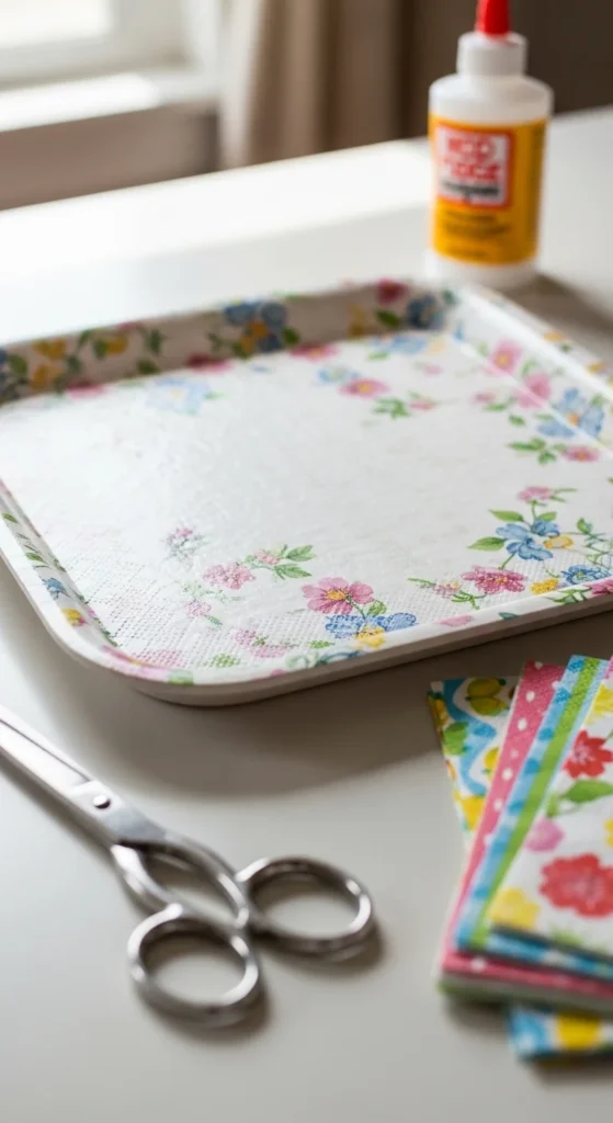 Choose a tray from a discount shop and select napkins with a design you enjoy. Separate the thin printed layer of the napkin and gently place it onto the tray surface.