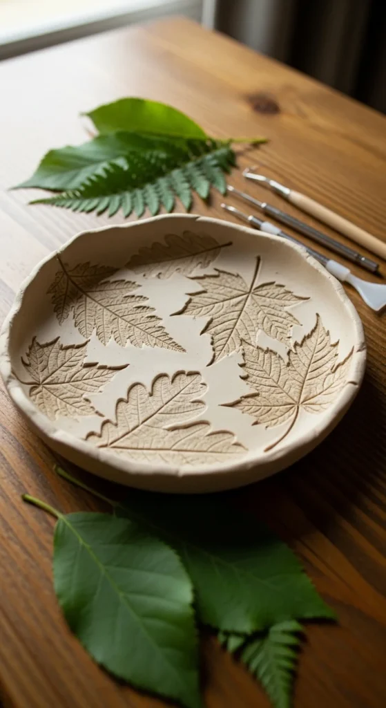Clay dishes with leaf prints create elegant nature-inspired décor.
