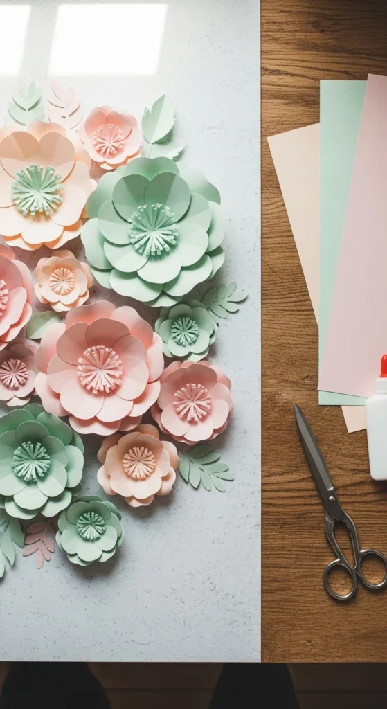 Paper flowers create decorative wall pieces that stay beautiful year-round.