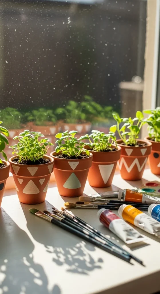 Painted pots brighten windowsills and shelves while staying budget friendly.