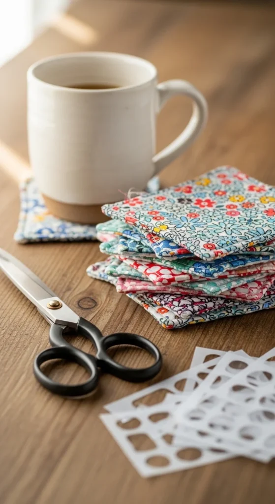 Fabric scraps from clothing or sewing projects can easily become coasters.