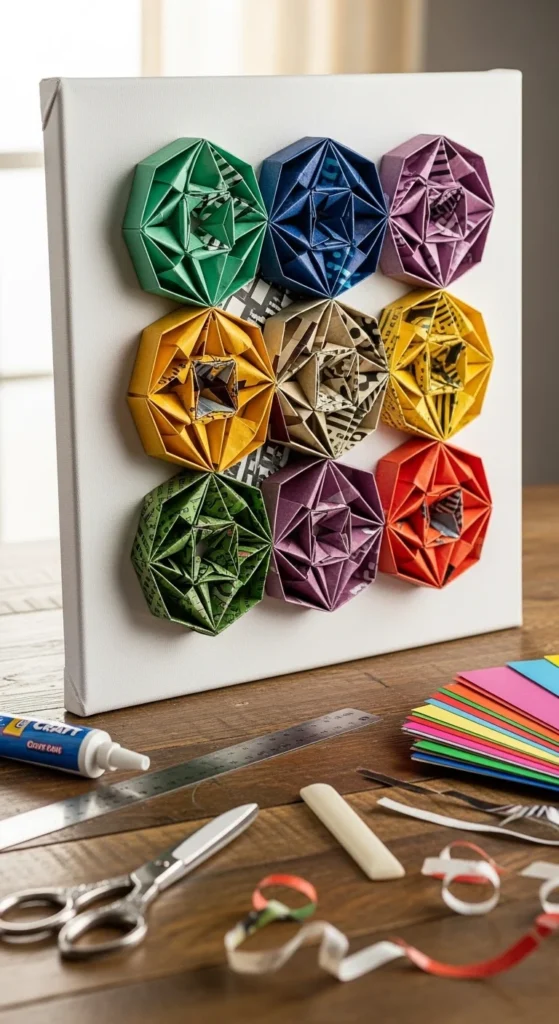 The result is colorful wall art made from recycled paper.