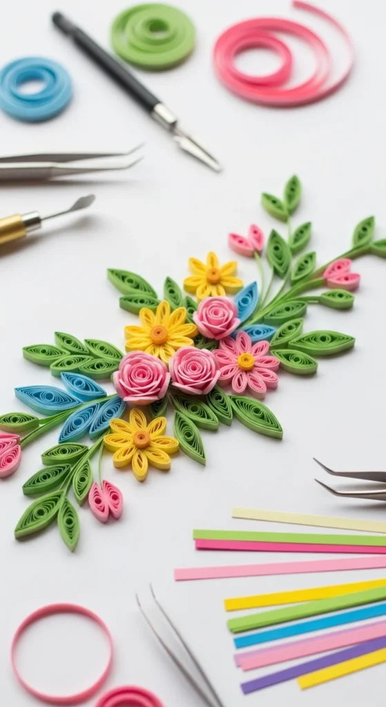 Paper quilling uses thin paper strips rolled into shapes.