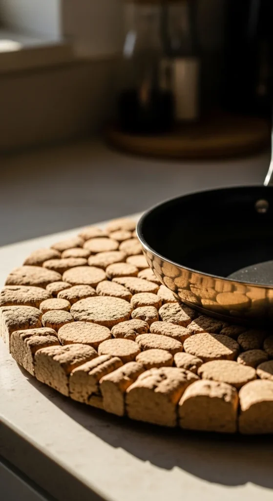 The natural cork texture fits well with rustic or minimalist kitchen styles.