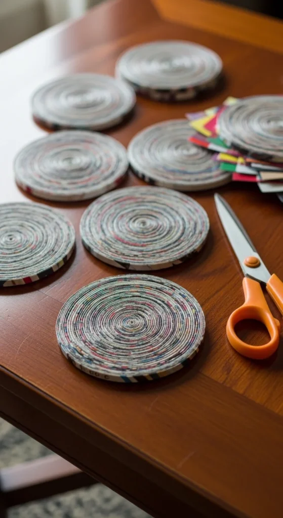 These coasters reuse printed paper while creating functional table accessories.
