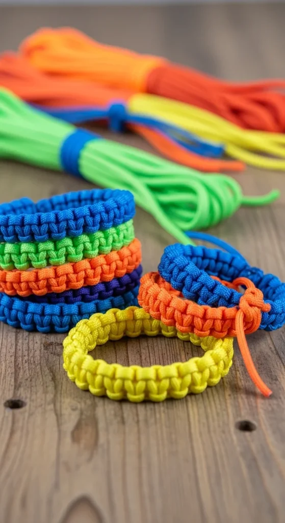 Braid colorful cord into bracelet patterns and attach simple clasps.