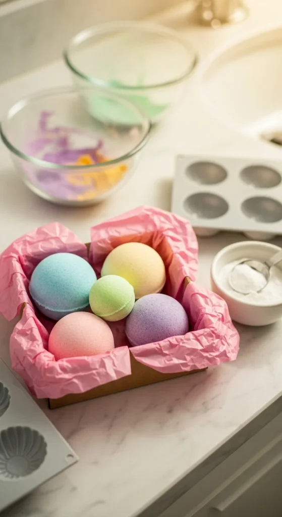 Wrap several bath bombs in tissue paper and place them in a small box.