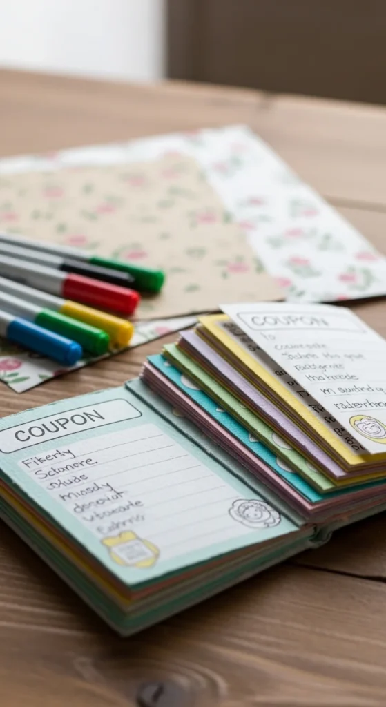 Cut several pieces of cardstock into small rectangles. Write different coupons on each page.