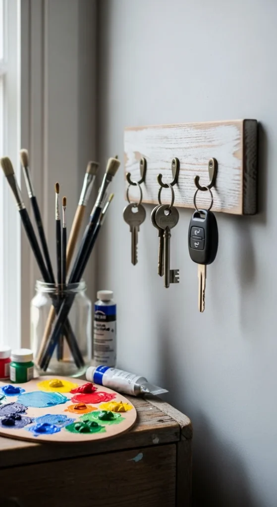 Once mounted on the wall, the board holds keys, lanyards, or small accessories.