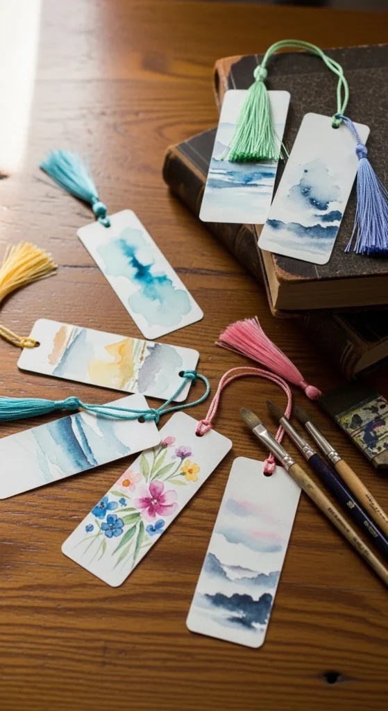 Cut thick paper into bookmark shapes. Decorate them with watercolor paint or patterned paper.
