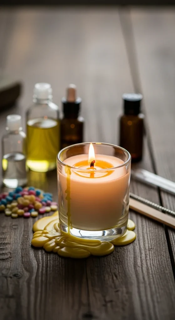 Melt wax flakes in a heat-safe container. Add fragrance oil and pour the wax into a small jar with a wick.