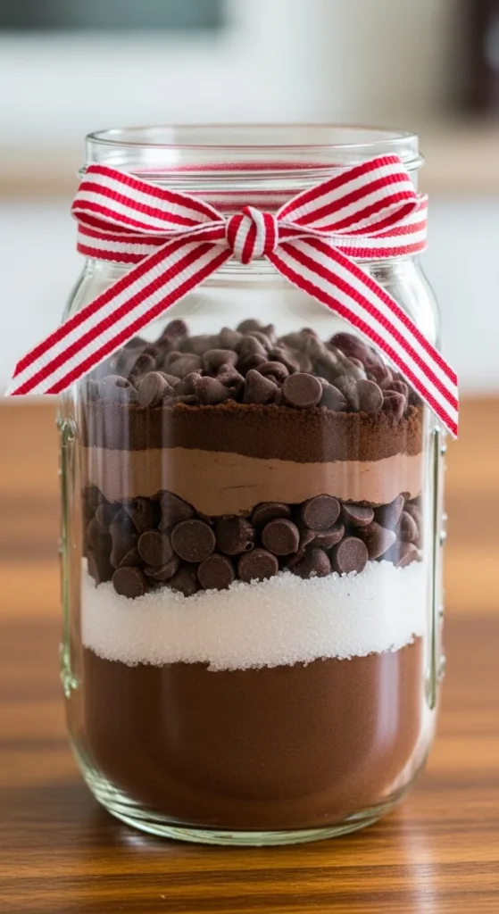 Layer cocoa powder, sugar, and chocolate chips in a jar.