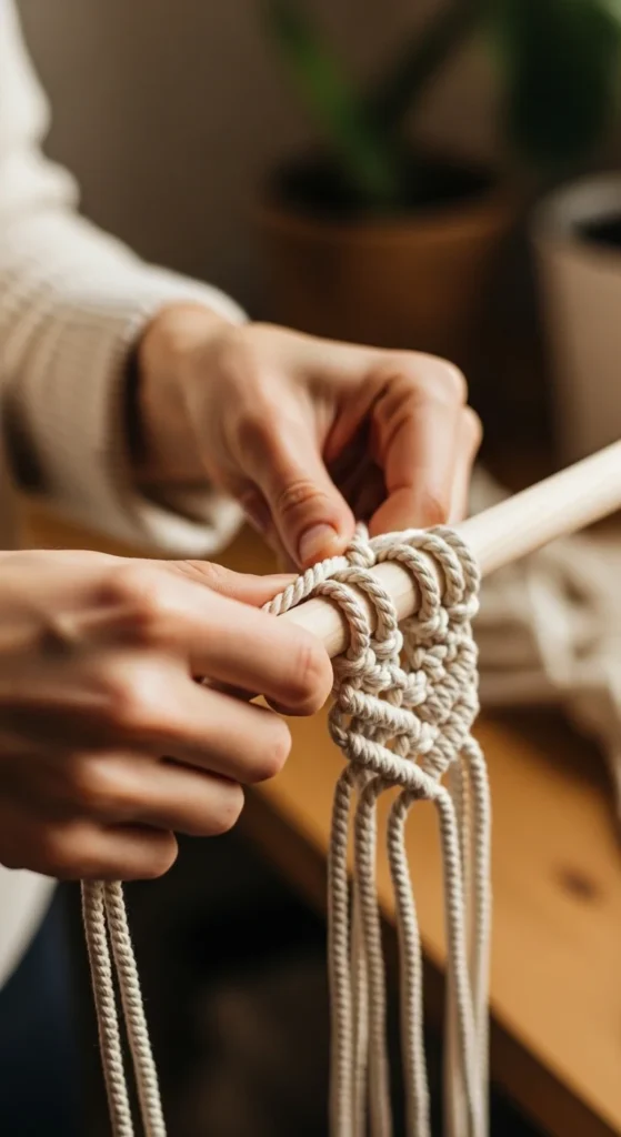 Start with basic cotton cord and a wooden dowel. Learn a few beginner knots like square knots and lark’s head. You do not need many patterns to create an attractive design.