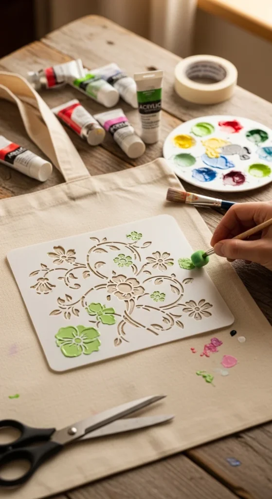Place a stencil over a plain canvas tote. Dab acrylic paint gently using a sponge or stencil brush.