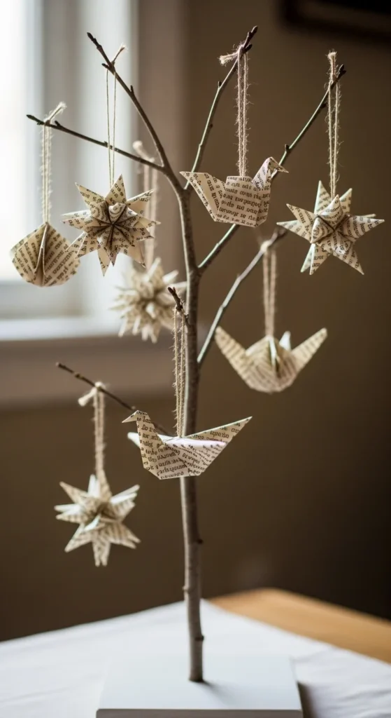 Fold small shapes like stars or hearts from book pages. Add string loops and hang them on a branch or small tree.