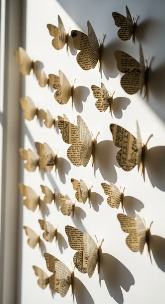 Butterflies made from book pages add soft movement to blank walls. Start by printing or tracing a simple butterfly template. Cut several sizes from aged pages for visual variety.