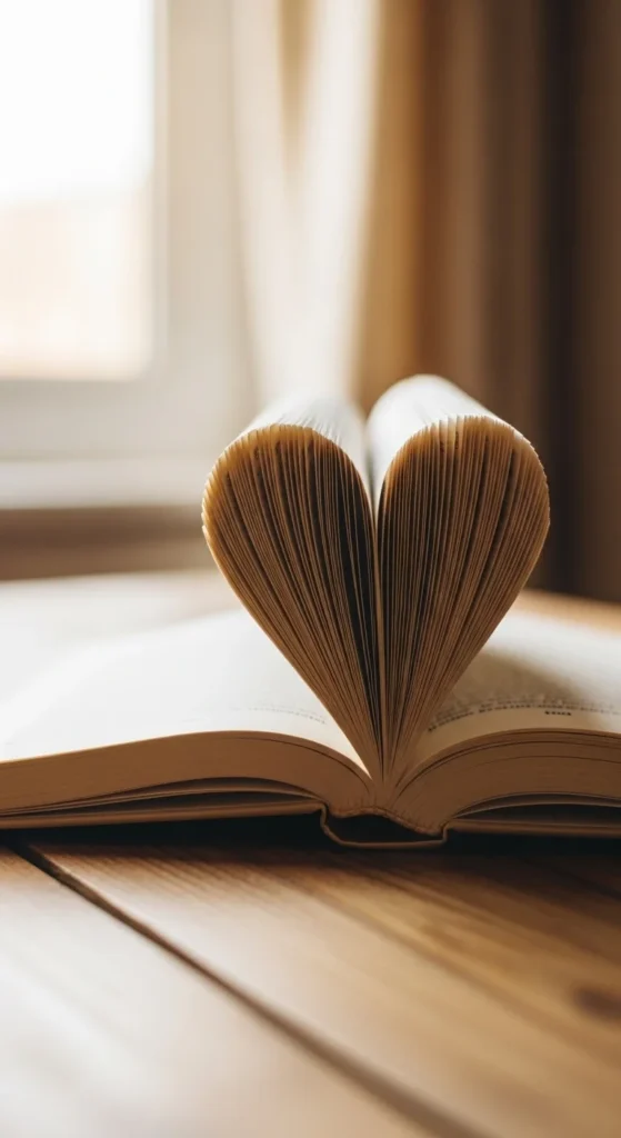 Fold each page inward toward the spine. Work slowly and keep folds crisp. Patience matters here. After enough pages are folded, a heart shape begins to appear when the book is opened.