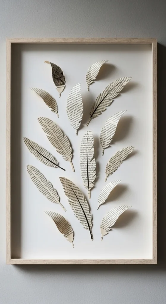 Feather shapes bring a light, airy feel to book page art. Sketch a simple feather outline and cut carefully along the edges.