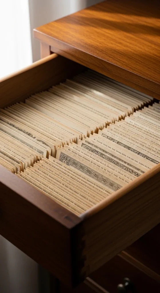 Line small drawers with book pages for hidden charm. Measure the drawer base and cut pages to fit.