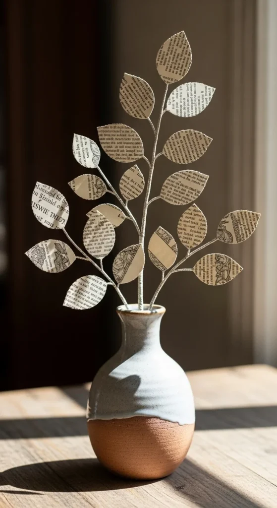 Create simple leaf shapes and attach them to thin branches using glue. Arrange the finished stems in a neutral vase.