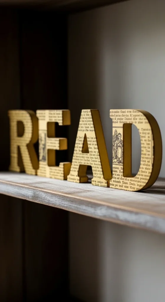 Wooden letters covered with book pages make personal decor. Brush glue onto the letter surface and press the paper down carefully.