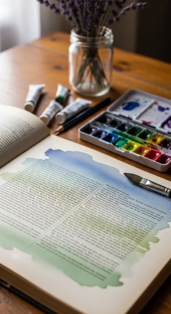 Watercolor adds soft color while keeping the printed words visible. Start with thicker book pages so the paper handles moisture better. Lightly tape the page to your work surface to reduce warping.