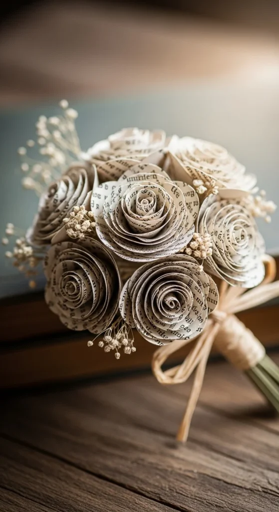 Paper roses made from book pages look romantic and timeless. Cut spiral circles from several pages. Roll from the outer edge toward the center, then glue the base to hold the flower shape.