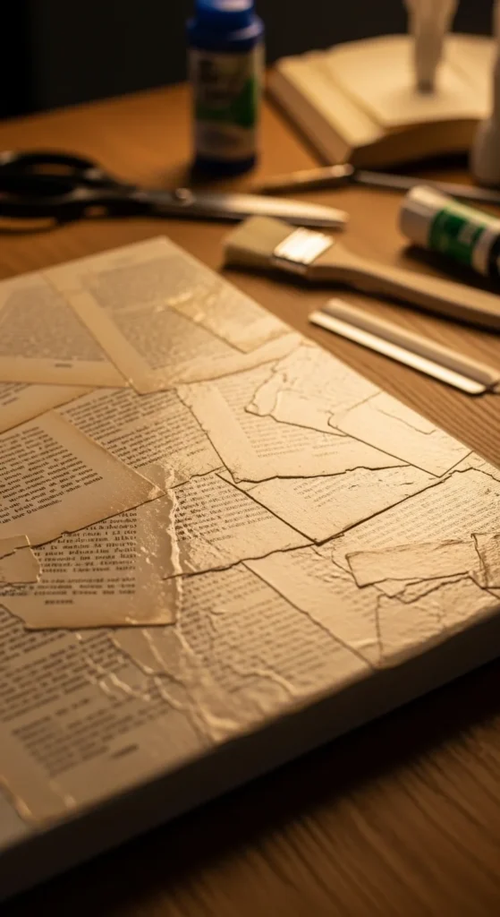 This project turns loose pages into textured wall art. Tear book pages into uneven pieces. Brush a thin layer of Mod Podge onto a blank canvas.