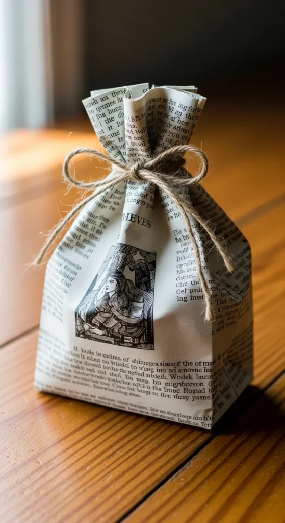 Turn book pages into small gift bags in minutes. Fold the page into a pouch shape and glue the side seams. Fold the bottom to create a flat base.