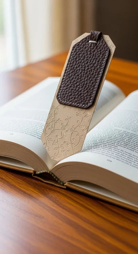 Cut a strip of thick cardstock or leather about six inches long. Round the corners so the bookmark slides easily between pages.