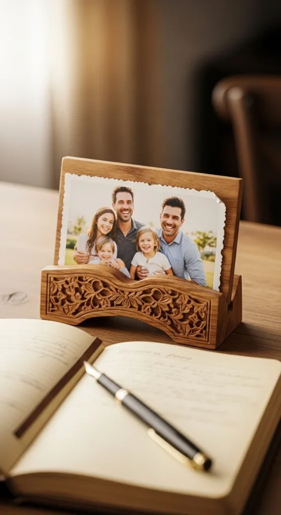 A wooden picture stand displays a favorite photo without using a large frame.