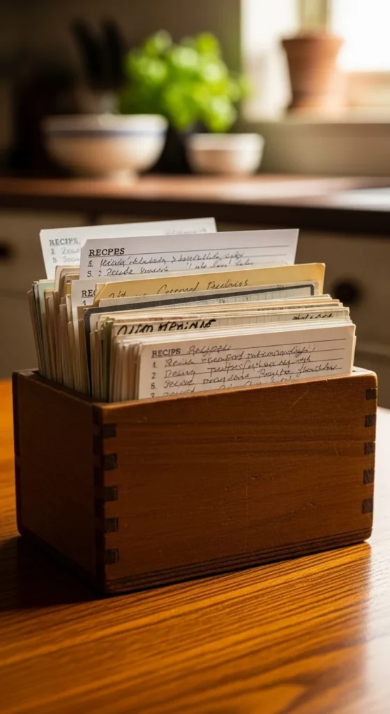 A recipe card box stores favorite family meals in one place.