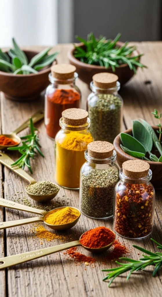 One jar could contain paprika, garlic powder, and black pepper. Another might include onion powder, chili powder, and herbs.