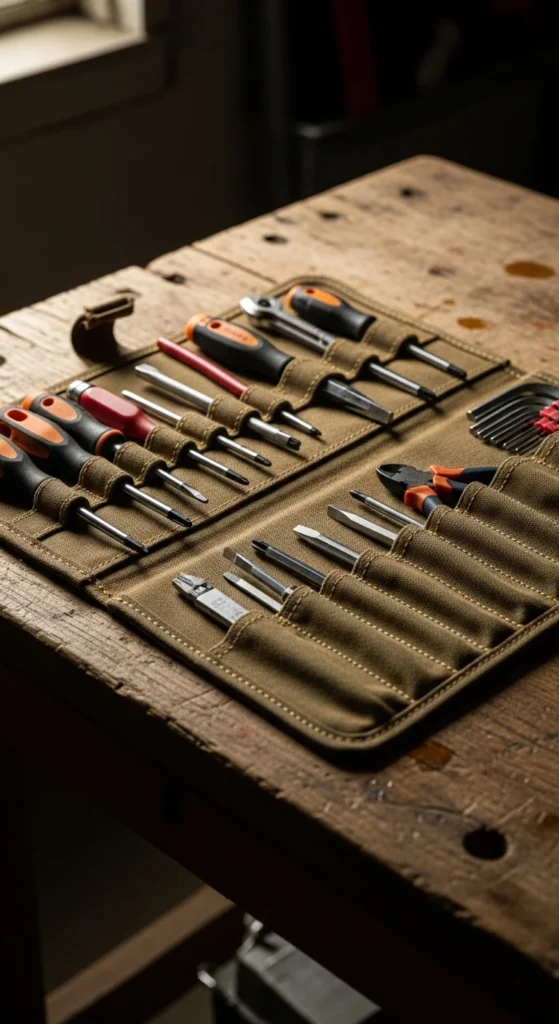 A tool roll keeps small tools neatly organized. It is useful for dads who enjoy fixing things around the house.