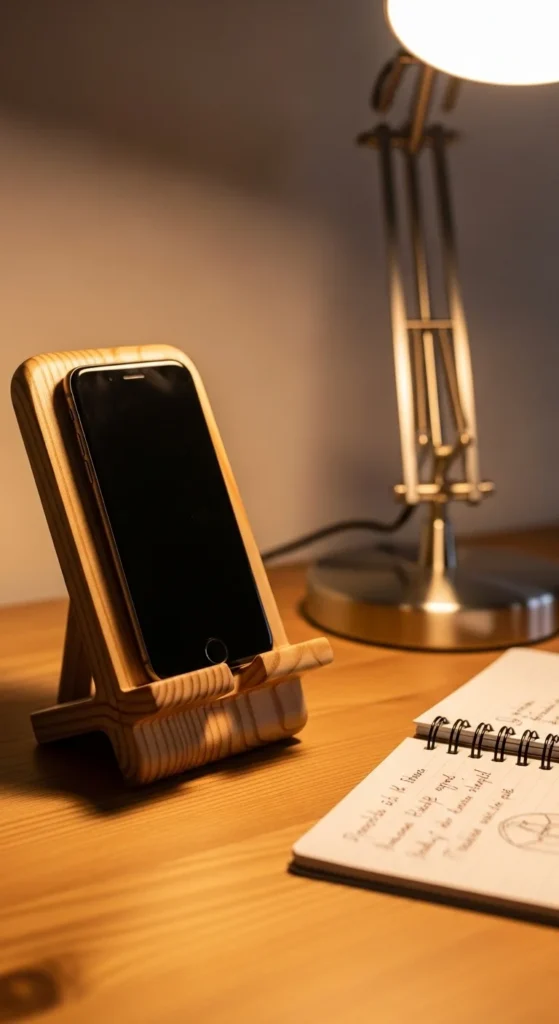 A wooden phone stand is simple yet very useful.
