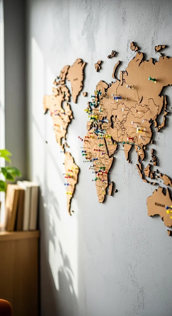 A cork map allows couples to track travel memories together.