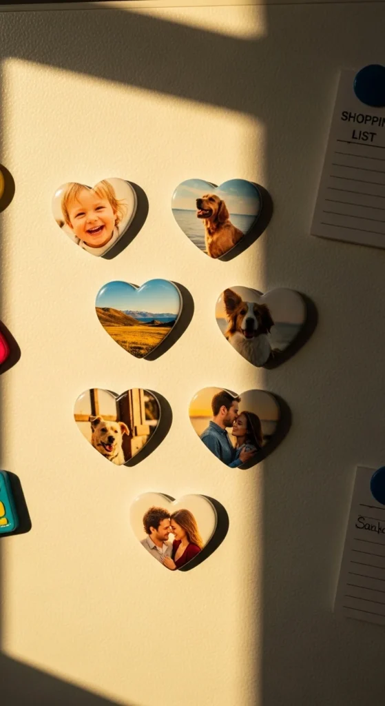 Print small photos and glue onto magnet sheets. Cut into heart shapes for a cute twist. These are quick to make, sentimental, and functional. You can add initials or small stickers for extra personalization. Materials cost about $5–8. This is a beginner-friendly craft that doubles as décor and keeps memories on display.