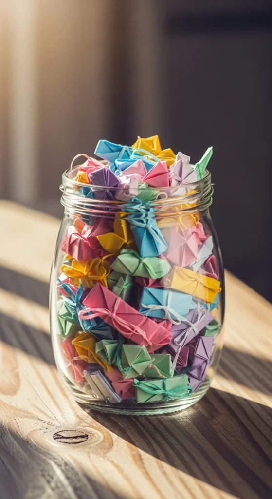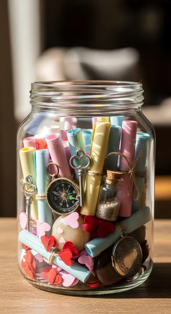Fill a jar with memories, ticket stubs, and tiny keepsakes from your relationship. Add folded notes describing moments or inside jokes. Decorate the jar with ribbon and small hearts. It’s inexpensive, around $5–8, and shows thoughtfulness and effort. This project takes 20–30 minutes and creates a gift that’s truly unique.