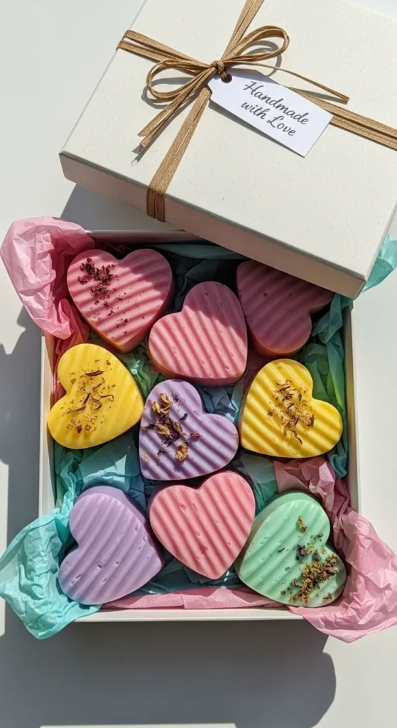 Melt and pour soap bases, add fragrance and colors, and pour into heart-shaped molds. Wrap with cellophane or place in a small box with ribbon. This self-care DIY costs $5–10 and takes less than 30 minutes. Even a beginner can create something that looks professional and feels indulgent.