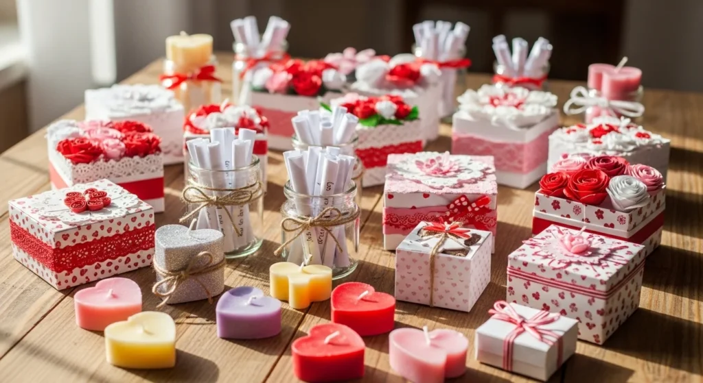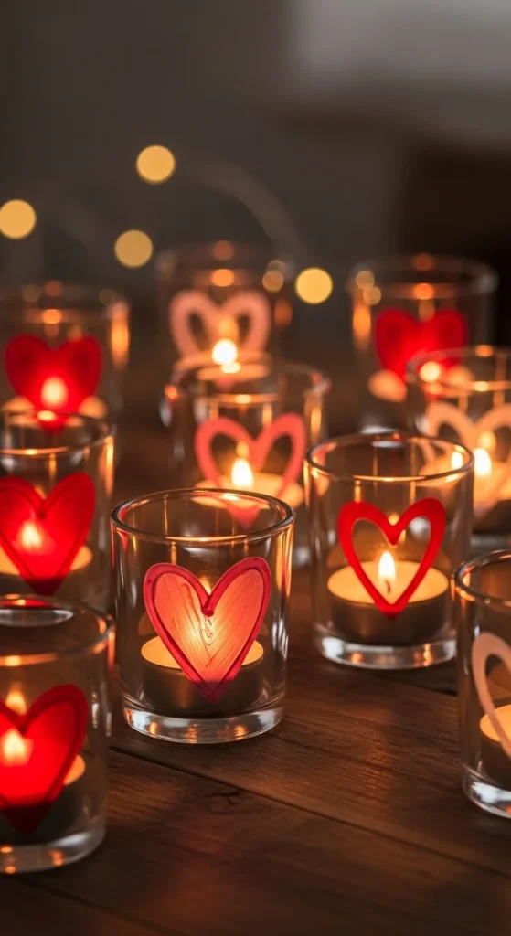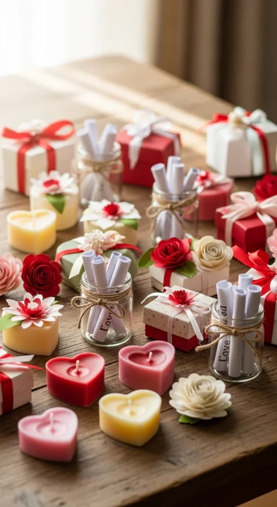 Create a cozy atmosphere with heart-shaped mason jar candles. Use simple supplies: jars, candle wax, and wicks. You can even add a few drops of essential oil for fragrance. Decorate the jars with ribbons or tiny paper hearts for a personal touch. These take under $10 to make and only 20–30 minutes, and they double as charming décor. For an extra personal touch, write a love note and tuck it under the jar lid.