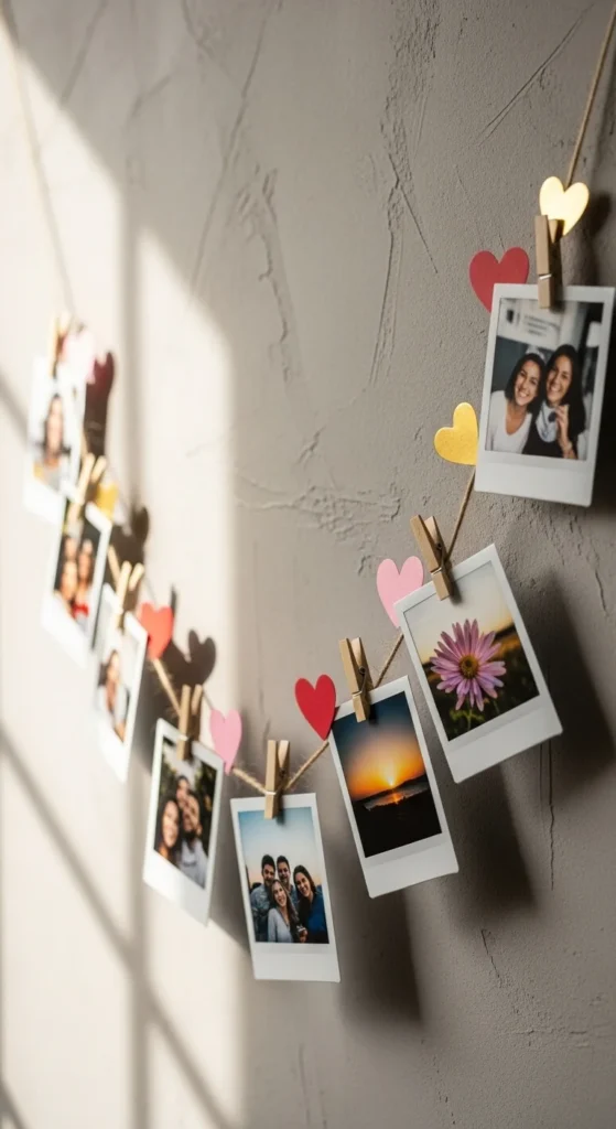Hang photos and notes on a string with clips. Add small hearts or fairy lights for a romantic display. It’s decorative, personal, and easy to assemble. Materials cost around $10, and this project takes 20–30 minutes. It’s ideal for displaying memories in a creative way.
