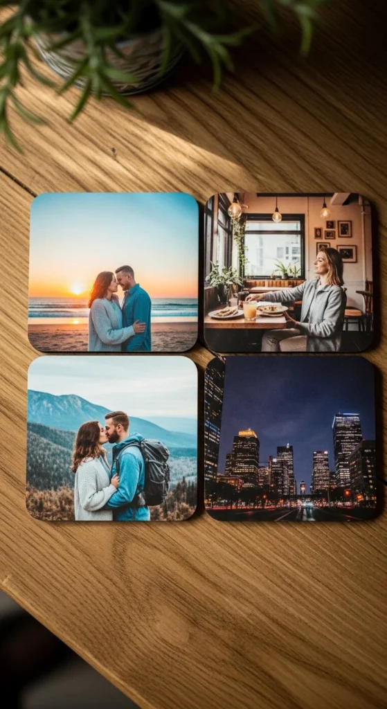 Turn your favorite photos into coasters. Print small images, glue them to ceramic tiles, and seal with mod podge. Add felt pads underneath to protect surfaces. This is an easy, sentimental gift that combines practicality with personalization. Coasters can be themed—pets, vacation memories, or inside jokes. Total cost is around $10–15 for a set of four, making this a budget-friendly, thoughtful keepsake.