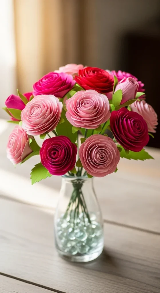 Craft paper flowers using simple colored paper, scissors, and glue. These last forever, unlike real blooms, and can be arranged in a small vase or wrapped like a bouquet. Mix colors and shapes for variety. Add a tag with a sweet message or initials for extra charm. Budget is minimal, around $5–8, and you can complete a bouquet in under 30 minutes, making it a quick, decorative gift.