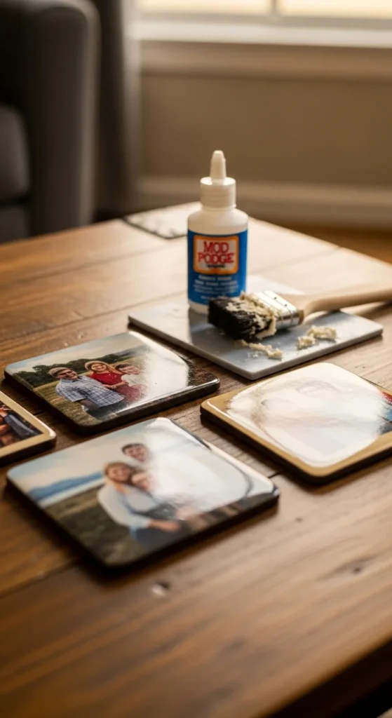 This is a fast gift that looks personal. Start with plain tile coasters or cheap wood squares. Print photos on regular paper. Keep images simple and high-contrast so they read well.