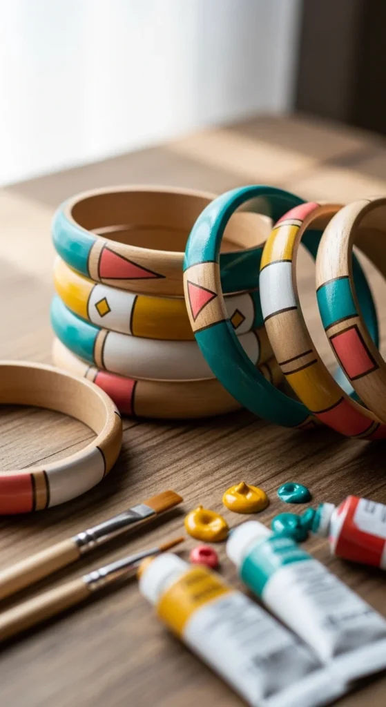 Use plain bangles and acrylic paint. Paint a base coat, let it dry, then add simple lines or dots.