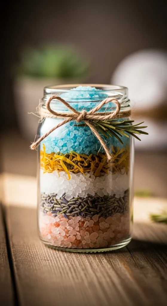 Mix Epsom salt with a small amount of fragrance oil or dried herbs. Layer it in a jar for a pretty look.